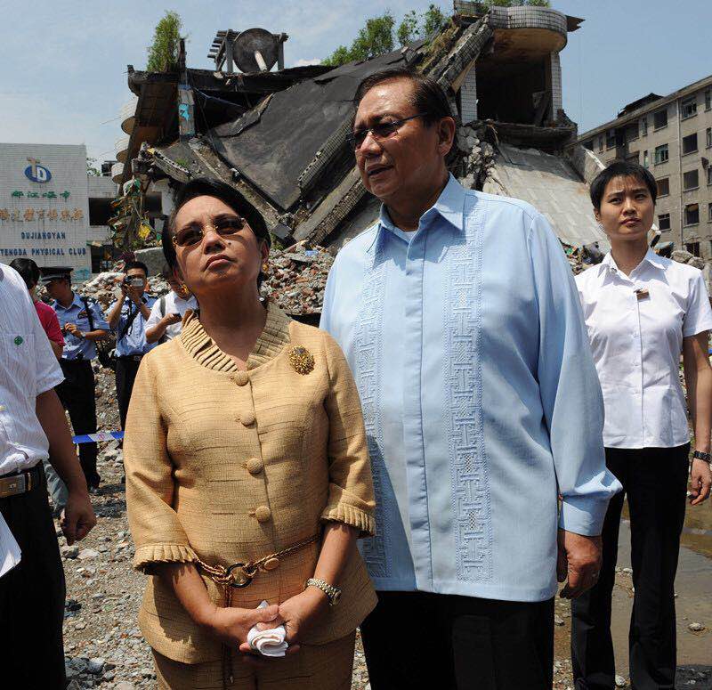 Arroyo visits the area struck by the Wenchuan earthquake in Sichuan province, on Aug 7, 2008, with her husband. YIN GANG/FOR CHINA DAILY