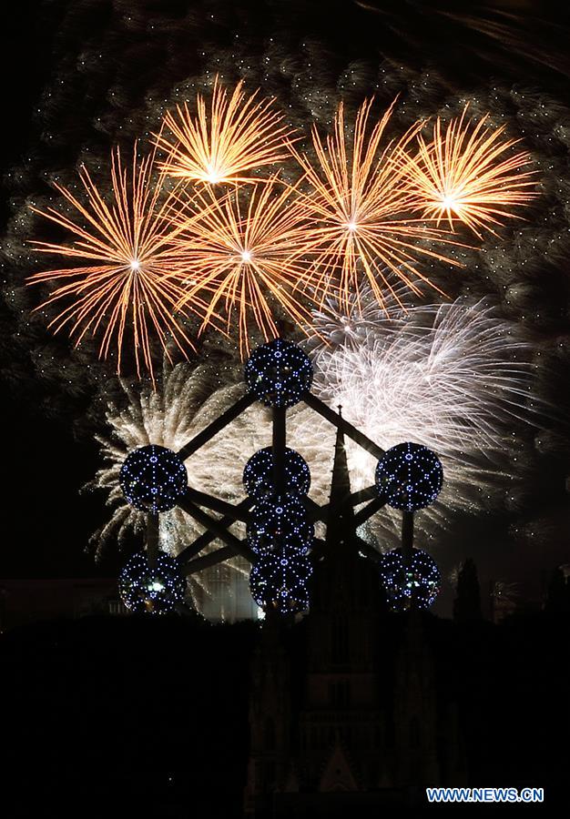Fireworks light up the sky and the famous Atomium landmark during Laeken Fireworks 2018 in Brussels, Belgium, Aug. 24, 2018. (Xinhua/Zheng Huansong)