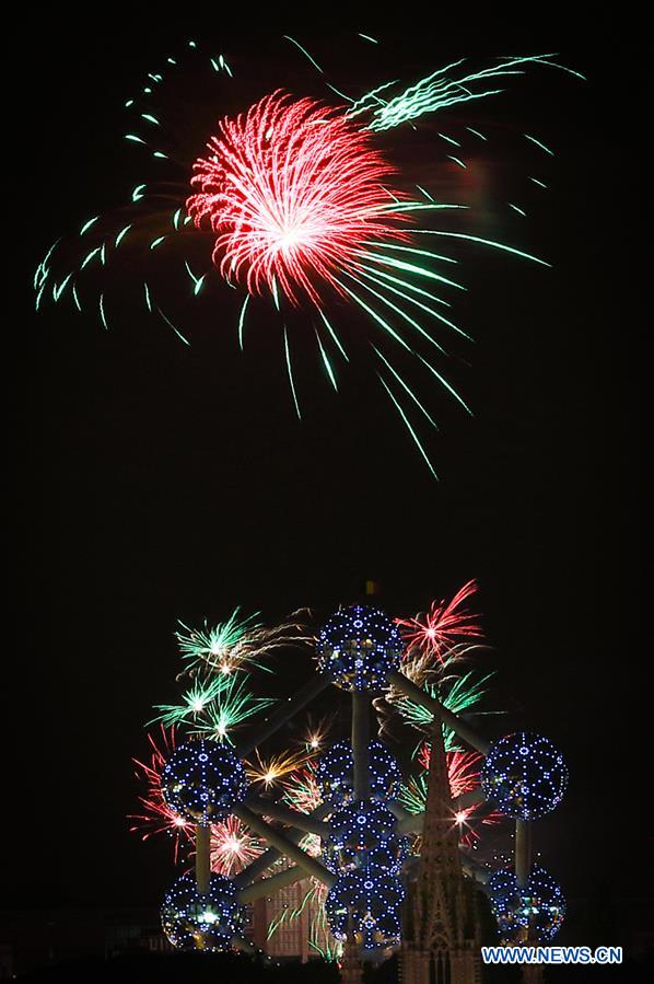 Fireworks light up the sky and the famous Atomium landmark during Laeken Fireworks 2018 in Brussels, Belgium, Aug. 24, 2018. (Xinhua/Zheng Huansong)