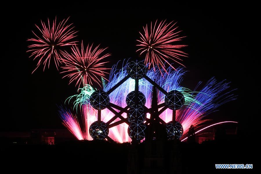 Fireworks light up the sky and the famous Atomium landmark during Laeken Fireworks 2018 in Brussels, Belgium, Aug. 24, 2018. (Xinhua/Zheng Huansong)