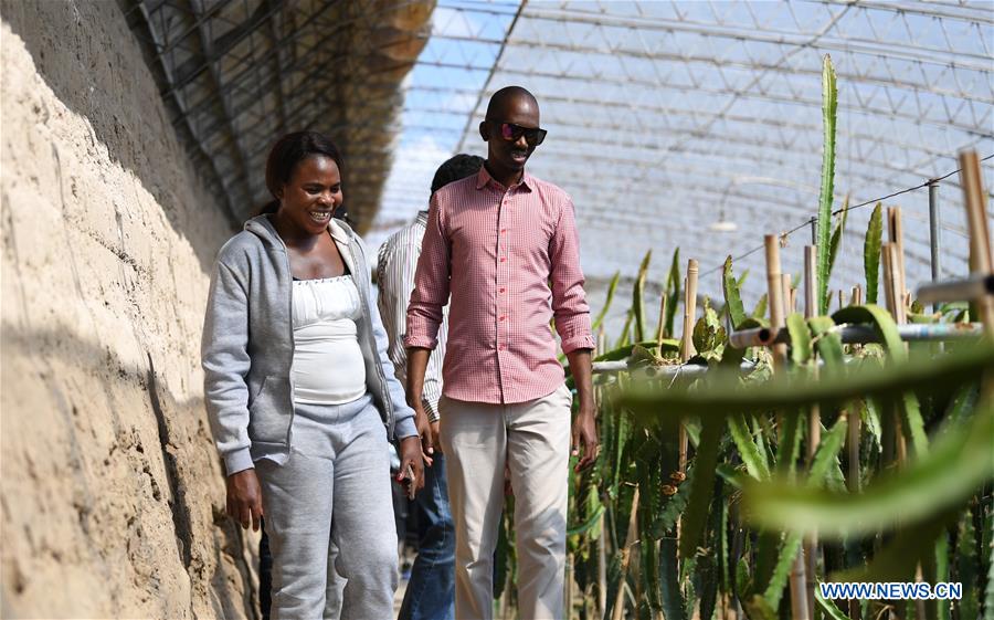 Nakanyala Elina Shekupe (L) and other students visit a greenhouse in Minqin County, northwest China's Gansu Province, Aug. 25, 2018. Shekupe, 37, is an agricultural technology official from Namibia. She and 11 other students are taking part in a desertification combating and ecological restoration training course organized by China's Ministry of Commerce in Gansu. "I hope more and more African friends will come to China to learn new technology on desert control and benefit people in their hometown, " she said. (Xinhua/Chen Bin)