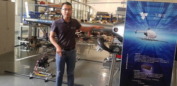 Michael Li, Media Manager of Efy Technology, introduces the MQ 300 drones to foreign journalists.