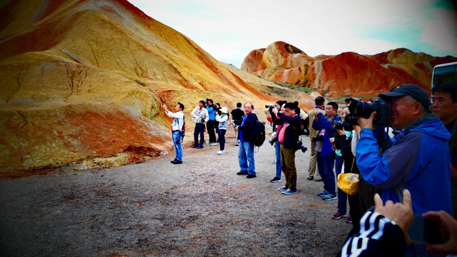 Journalists take photos of the beautiful scenery of Danxia Landform in Zhangye, northwest China's Gansu Province. (Photo/Courtesy of Zhao Jianwei)