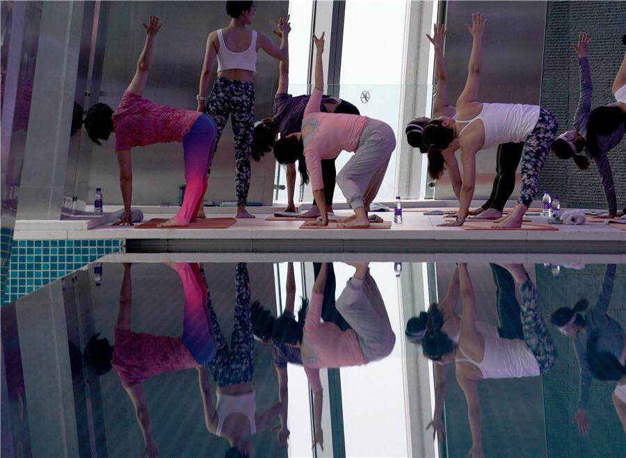 Yoga devotees practice by the swimming pool on the 78th floor of the China World Summit Wing. CHEN JIANLI/XINHUA