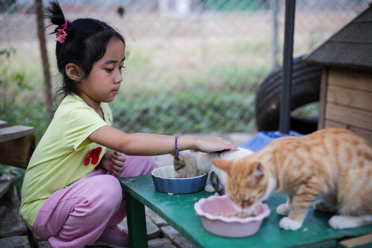 Some young students along with their parents also join the cat lovers' team to care for the cats together. [Photo by Tang Tao for chinadaily.com.cn]