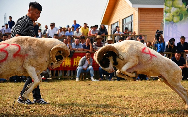 Farmers watch rams do battle in Dangshan county, Anhui province, on Wednesday. The event was held to mark the harvest of pears. Pears and small-tailed sheep are specialty products of the county. CUI MENG/FOR CHINA DAILY