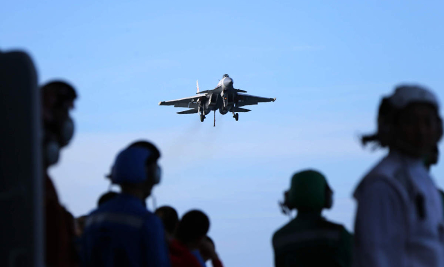 A J-15 fighter jet approaches the recovery area of the CNS Liaoning at the end of a training flight. [LI TANG/FOR CHINA DAILY]