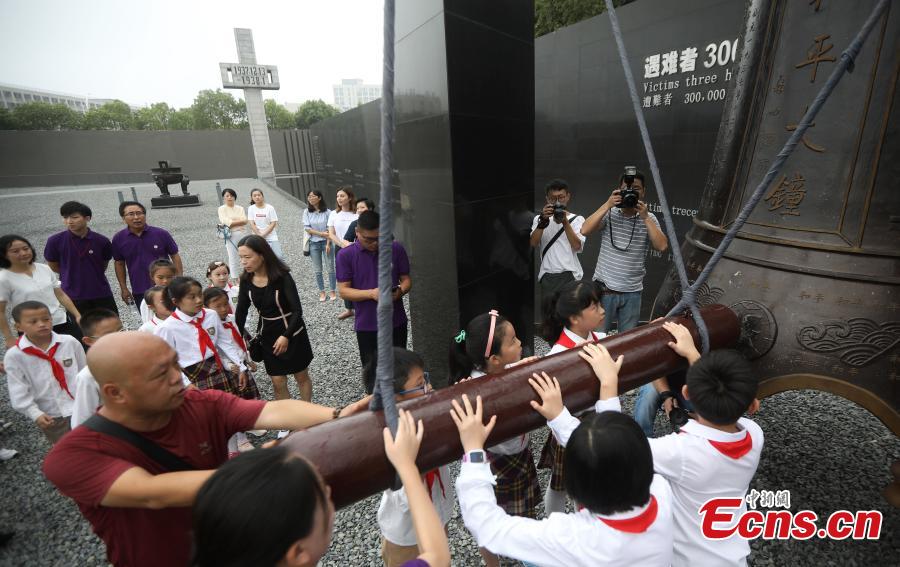 Visitors strike the Peace Bell at the Memorial Hall of the Victims in Nanjing Massacre by Japanese Invaders in Nanjing City, Jiangsu Province, Sept. 18, 2018. On September 18, 1931, the Japanese Kwantung Army stationed in northeast China destroyed a section of the railway near Liutiaohu and then falsely accused the Chinese military of causing the explosion. Using this as a pretext, the Japanese then bombarded Shenyang and began invasion of northeast China. (Photo: China News Service/Yang Bo)