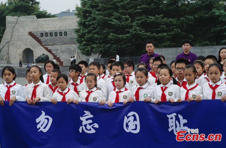 Students mourn the deceased in silence at the Memorial Hall of the Victims in Nanjing Massacre by Japanese Invaders in Nanjing City, Jiangsu Province, Sept. 18, 2018. On September 18, 1931, the Japanese Kwantung Army stationed in northeast China destroyed a section of the railway near Liutiaohu and then falsely accused the Chinese military of causing the explosion. Using this as a pretext, the Japanese then bombarded Shenyang and began invasion of northeast China. (Photo: China News Service/Yang Bo)