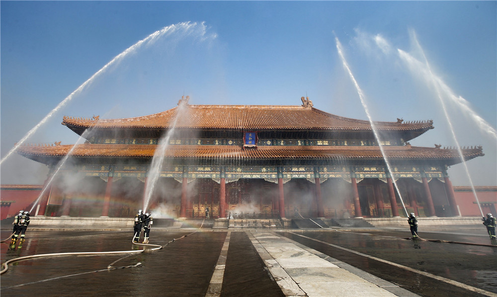Drills are staged frequently at the Palace Museum in Beijing, where a team is stationed by the east gate to keep watch for fire in turn 24 hours a day. LIU CHANG/FOR CHINA DAILY