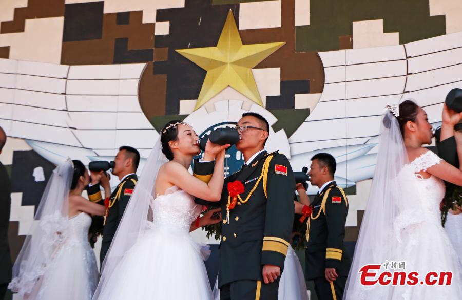 PLA Army soldiers take part in a group wedding ceremony on Sept. 27, 2018. Forty-eight pairs of couples had their wedding ceremony delayed due to a military mission. (Photo: China News Service/Liu Yishan)