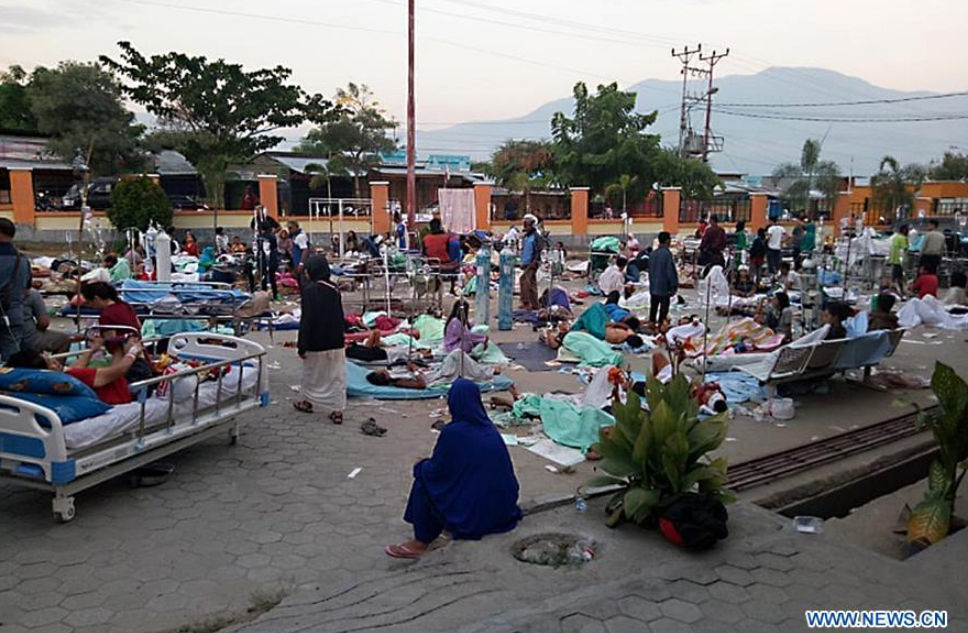 A handout photo provided by the Indonesian National Board for Disaster Management on Sept. 29, 2018 shows patients staying in a yard of Undata Regional Hospital in Palu, Indonesia's Central Sulawesi province. At least 48 people were killed and 356 others injured as strong earthquakes and ensuing tsunami rattled Indonensia's Central Sulawesi province on Friday, a disaster agency official said on Saturday. (Xinhua/BNPB HAND OUT)