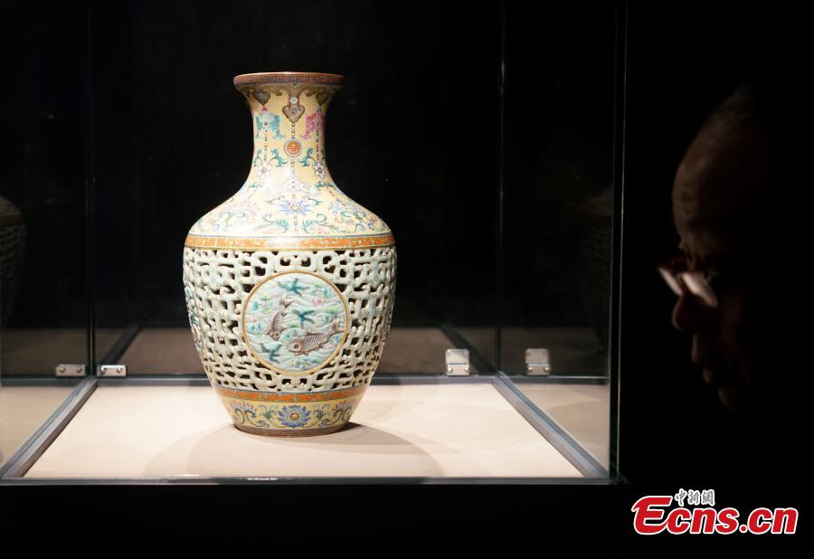 A vase made during the reign of Emperor Qianlong (1700s) fetched 149 million Hong Kong dollars (19 million U.S. dollars) at Sotheby's autumn auctions in Hong Kong. (Photo: China News/Zhang Wei)