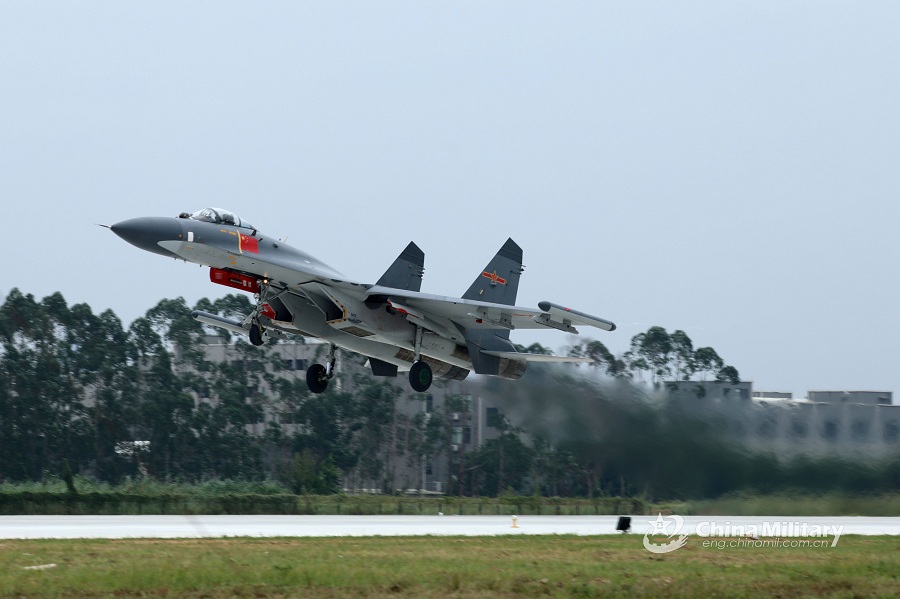 A J-11 fighter jet attached to an aviation brigade of the air force under the PLA Southern Theater Command takes off during a flight training exercise on Sept. 28, 2018. (eng.chinamil.com.cn/Photo by Tang Jun)