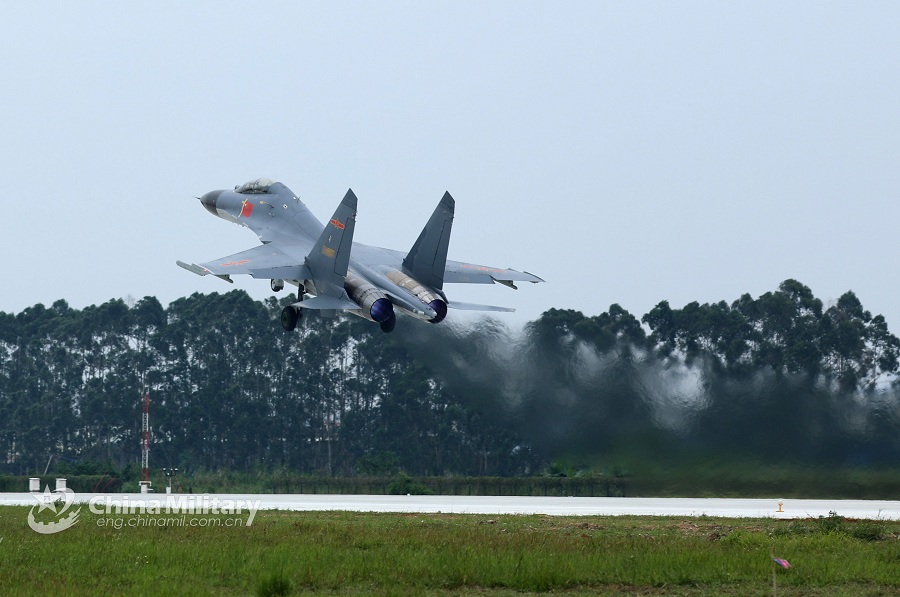 A J-11 fighter jet attached to an aviation brigade of the air force under the PLA Southern Theater Command takes off during a flight training exercise on Sept. 28, 2018. (eng.chinamil.com.cn/Photo by Tang Jun)