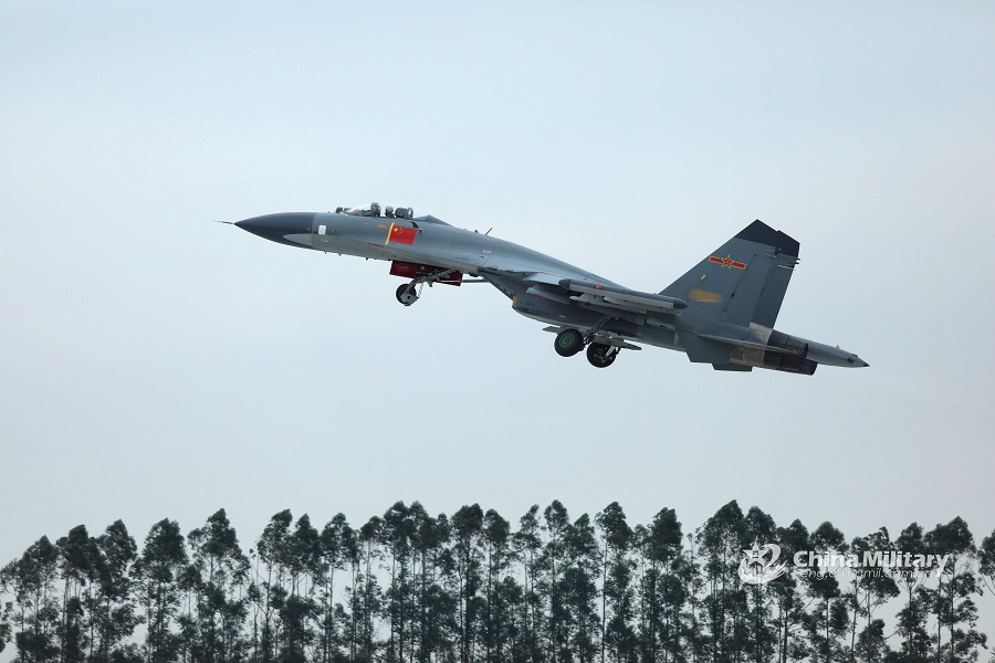 A J-11 fighter jet attached to an aviation brigade of the air force under the PLA Southern Theater Command takes off during a flight training exercise on Sept. 28, 2018. (eng.chinamil.com.cn/Photo by Tang Jun)