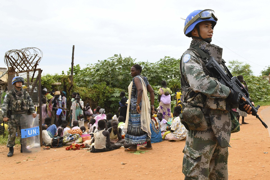 Chinese peacekeepers protect local people in a camp where weapons were confiscated in Juba in May. Provided to China Daily
