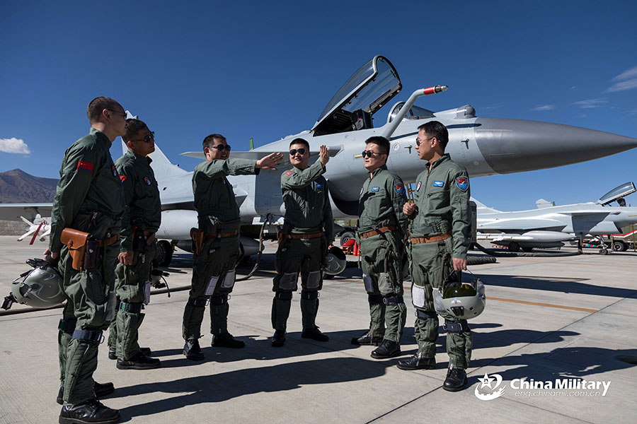 A group of J-10 fighter jets attached to an aviation brigade of the air force under the PLA Central Theater Command sit abreast on the flightline as they receive power-on inspections prior to a recent night flight training exercise. (eng.chinamil.com.cn/Photo by Liu Shaoqiang)