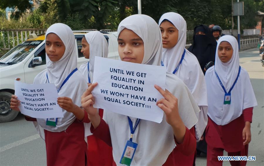 Girls from Muslim community chant slogans as they participate in a rally to mark International Day of Girl Child in Kathmandu, Nepal, Oct. 11, 2018. (Xinhua/Sunil Sharma)