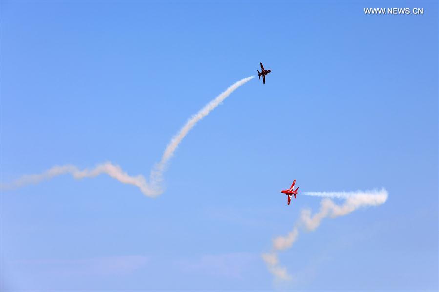 Photo taken on Oct. 13, 2018 shows model aircrafts with turbojet engines perform in the air during a contest in Rongcheng, east China's Shandong Province. A total of 12 teams from around the world compete in the air. (Xinhua/Lin Haizhen)