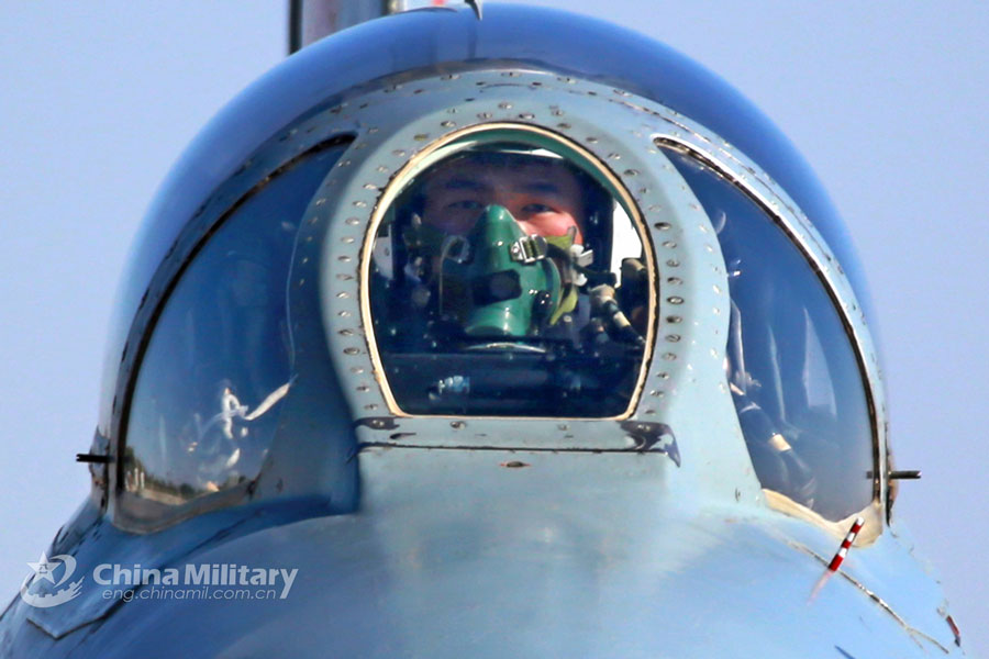 A pilot cadet assigned to a brigade with the PLA Air Force Xi'an Flight Academy gets settled in the cockpit of a J-7 fighter jet prior to a flight training course near the Qilian Mountains in northwest China's Gansu Province on September 20, 2018. (eng.chinamil.com.cn/Photo by Cui Baoliang and Wang Shaofei)