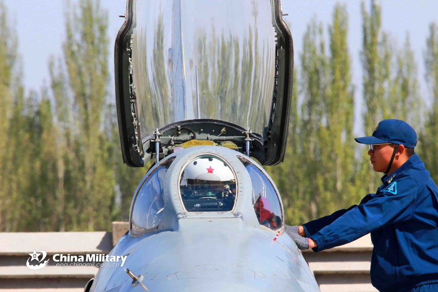 A maintenance man assigned to a brigade with the PLA Air Force Xi'an Flight Academy helps a pilot cadet to go through pre-flight inspections prior to a flight training course near the Qilian Mountains in northwest China's Gansu Province on September 20, 2018. (eng.chinamil.com.cn/Photo by Cui Baoliang and Wang Shaofei)