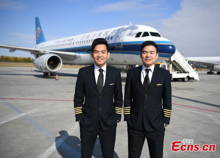 Twin brothers Liu Ke (L) and Liu Xin pose for a photo near a China Southern Airlines aircraft on Oct. 16, 2018. The twin brothers, born in 1987, were from a young age both interested in becoming pilots. After graduating high school, they both went on to study at the Civil Aviation Flight University of China. Later, both became pilots for China Southern Airlines. (Photo: China News Service/Zhang Yao)