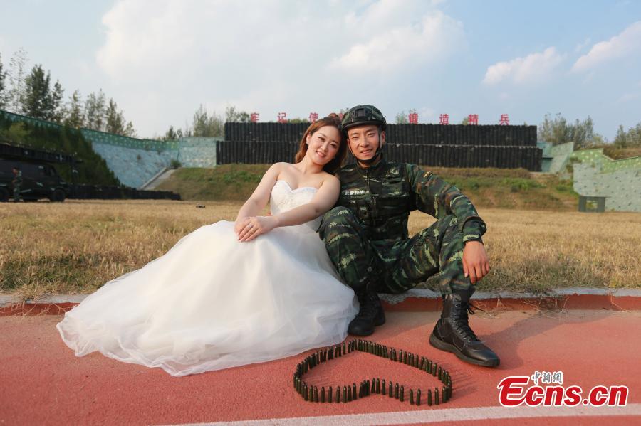 An armed police squad head in Yantai City, East China’s Shandong Province and his wife took special wedding photos at a barrack amid cheers and support of other members of the paramilitary police unit. (Photo: China News Service/Yang Lei)