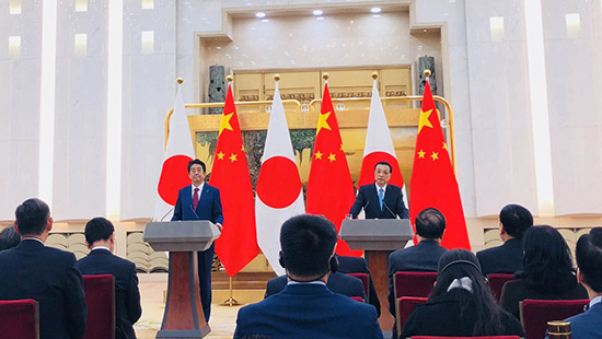 Chinese Premier Li Keqiang and Japanese Prime Minister Shinzo Abe attended a joint press conference in Beijing to announce the outcomes of Abe's visit to Beijing, on Oct 26, 2018. [Photo/CGTN]