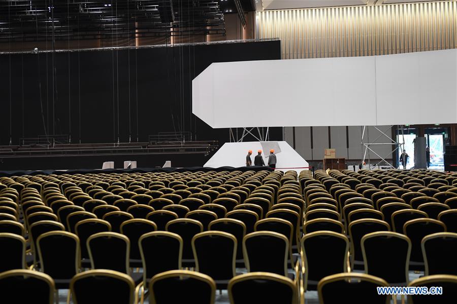 Staff members work at the Wuzhen International Internet Exhibition and Convention Center in Wuzhen, east China's Zhejiang Province, Oct. 30, 2018. The fifth World Internet Conference (WIC) will be held this November in the river town of Wuzhen. (Xinhua/Huang Zongzhi)