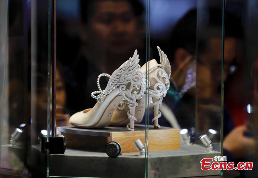 A pair of shoes with jewelries are exhibited at China International Import Expo (CIIE) in Shanghai. (Photo: China News Service/Du Yang)
