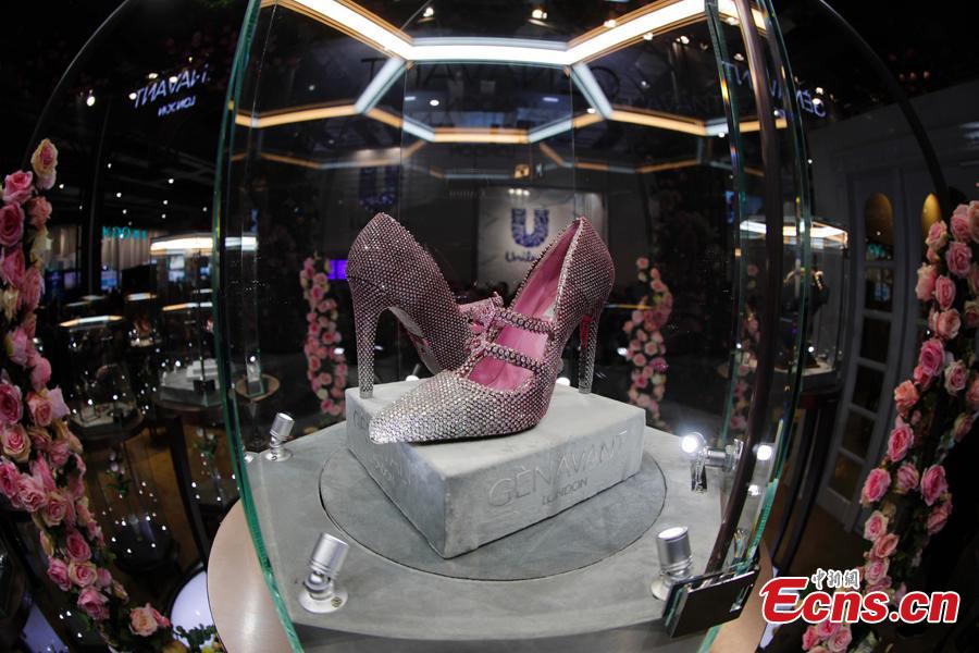 A pair of diamond shoes worth $4.35 million made their debut at China International Import Expo (CIIE) in Shanghai. They are designed and made by couture shoe designer Jimmy Choo. (Photo: China News Service/Du Yang)