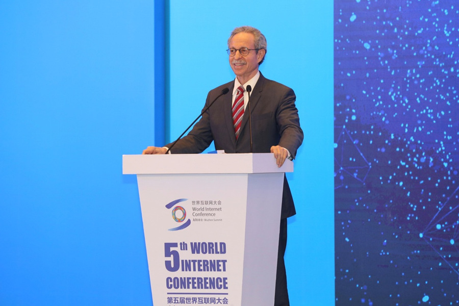 Robert Lawrence Kuhn, chairman of the Kuhn Foundation, hosts the keynote speech I: Digital Divide and Economic Development at a ministerial forum themed "Bridging the Digital Divide" in Wuzhen, East China's Zhejiang province on Nov 8, which serves as a sub-forum of the fifth World Internet Conference. [Photo by Xu Jingxing /chinadaily.com.cn]