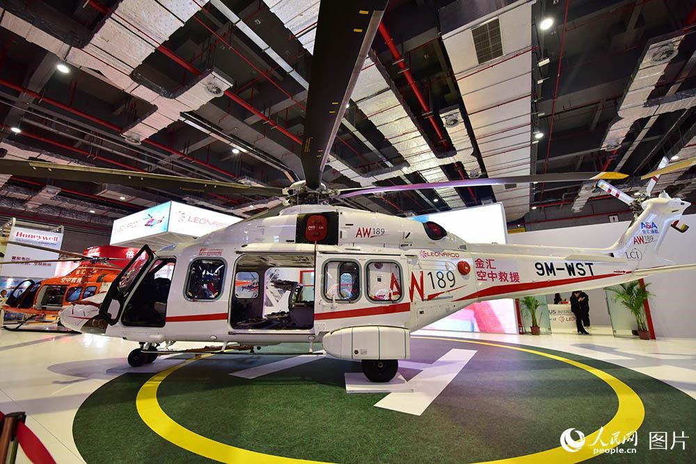 The AgustaWestland AW189 helicopter worth 200 million yuan is the most expensive product displayed at the CIIE. Photo by Weng Qiyu from People’s Daily Online
