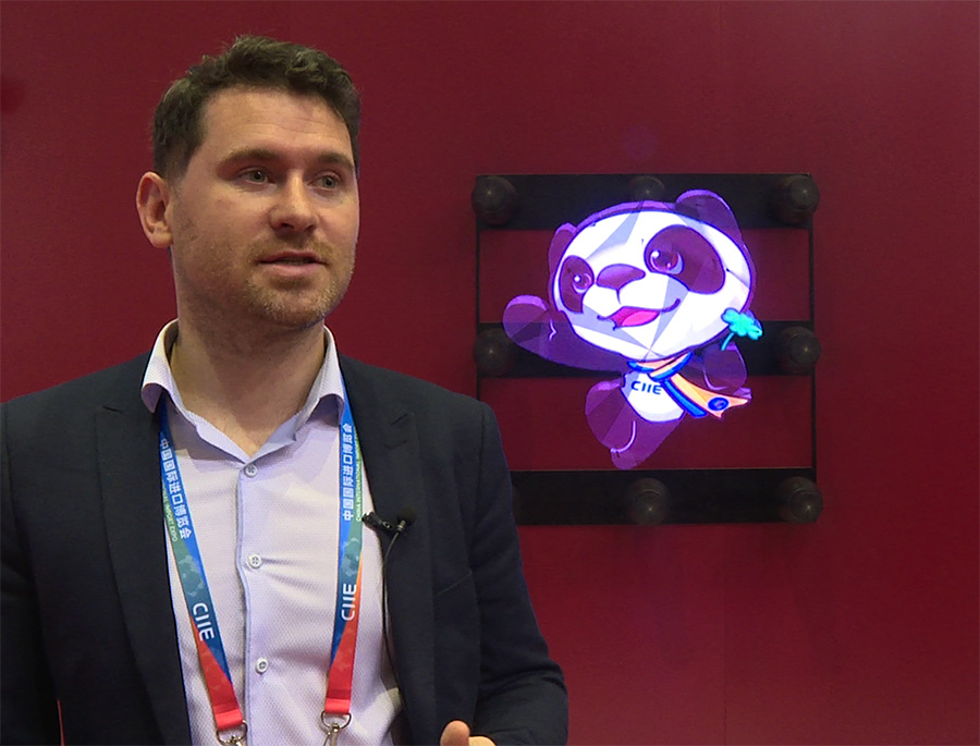Art Stavenka, co-founder of HyperVSN, talks to Peoples Daily Online in front of a hologram of Jinbao the CIIE mascot.