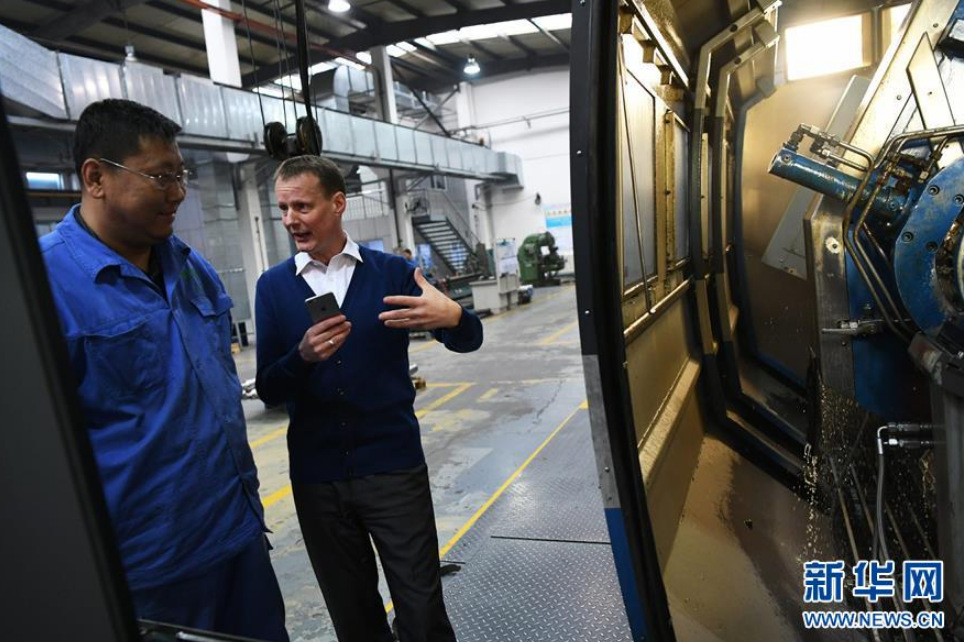Stephen exchanges ideas with his colleague in the NETZSCH workshop. (Photo/Xinhua)