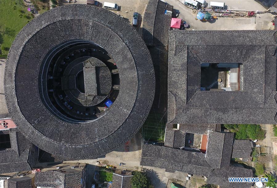 Photo taken on Nov. 23, 2018 shows Huaiyuan Tulou (L) and Fuyuan Tulou in Kanxia Village in Nanjing County of Zhangzhou City, southeast China's Fujian Province. Fujian Tulou, which dates back to Song and Yuan dynasties, is a type of Chinese rural dwellings of the Hakka people in the mountainous areas in Fujian Province. The layout of Fujian Tulou followed the Chinese dwelling tradition of "closed outside, open inside" concept: an enclosure wall with living quarters around the peripheral and a common courtyard at the center. In 2008, Tulou was added to the World Heritage List as a cultural site. (Xinhua/Lin Shanchuan)