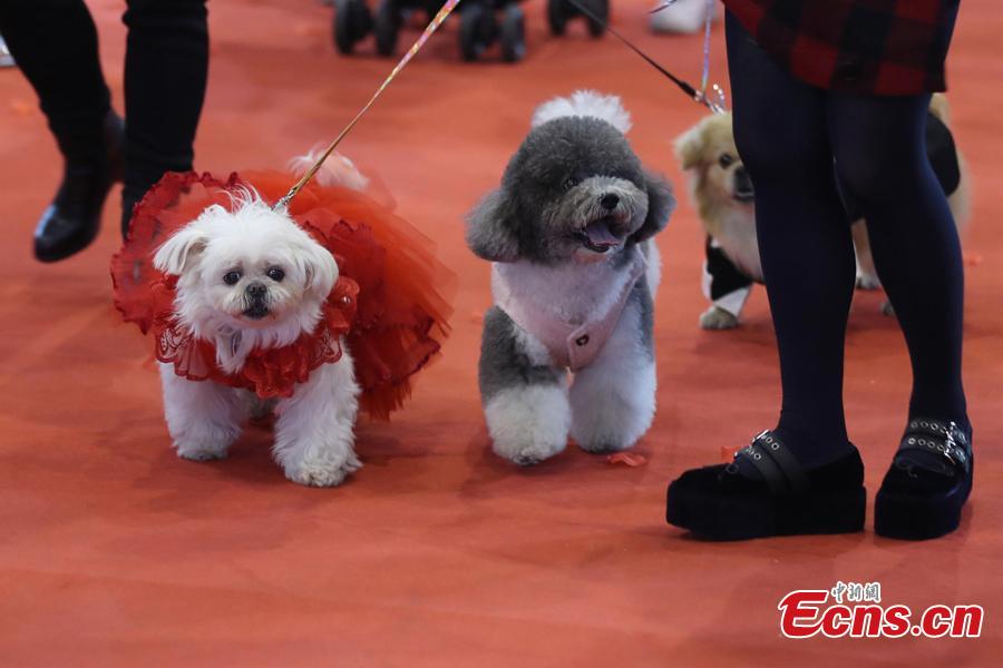 A "group wedding" is held for nearly 100 pet dogs of different breeds at the 2108 China (Nanjing) Pet Culture Festival in Nanjing, Jiangsu Province, Nov. 24, 2018. (Photo: China News Agency/Yang Bo)