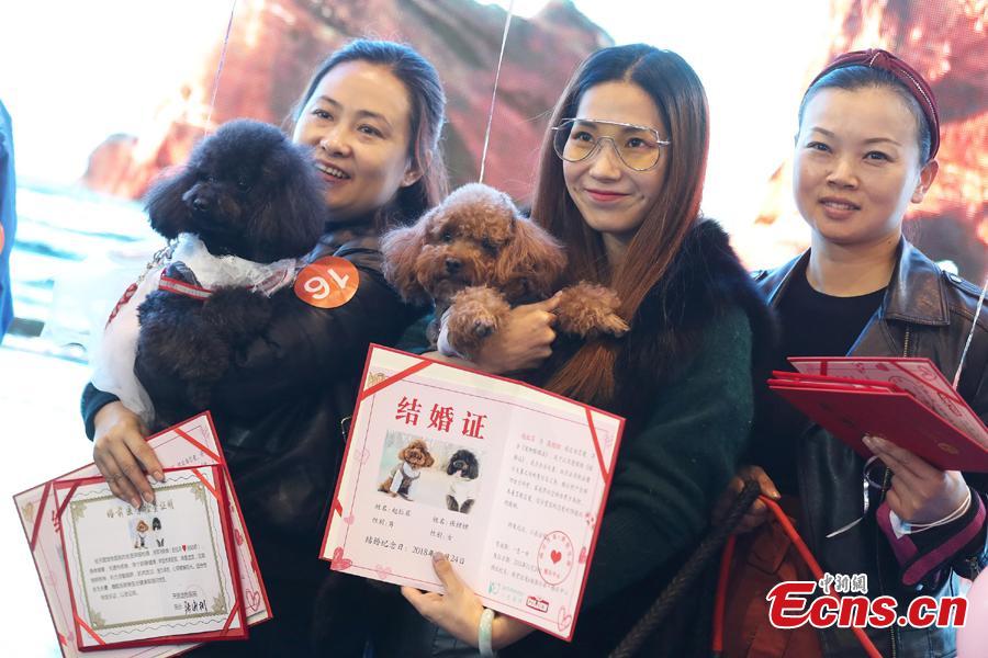 Pet dog owners pose for a photo with their dogs at the 2108 China (Nanjing) Pet Culture Festival in Nanjing, Jiangsu Province, Nov. 24, 2018. A "group wedding" was held for nearly 100 pet dogs of different breeds at the festival (Photo: China News Agency/Yang Bo)