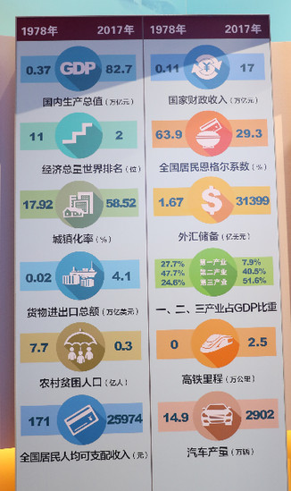 This graphic compares China's economic index, including GDP from 1978 and 2017. GDP has increased from 0.37 trillion yuan in 1978 to 82.7 trillion yuan in 2017. The fiscal revenue increased from 0.11 trillion yuan to 17 trillion yuan. The urbanization rate increased from 17.92 to 58.52 percent.