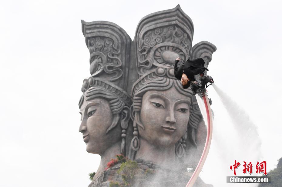 A man performs Tai Chi using flyboards at a tourism resort in Guilin, Guangxi Zhuang Autonomous Region, on November 24, 2018. [Photo: Chinanews.com]