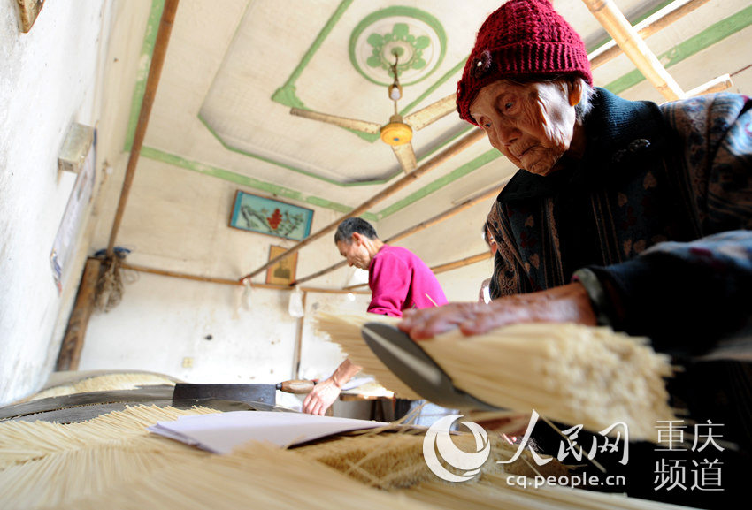 Photo taken on Nov. 25 shows centenarian Deng Kaiming drying noodles in her kitchen in a village in Chongqing, southwest China. (Photo/Zhou Bangjing from People’s Daily Online)