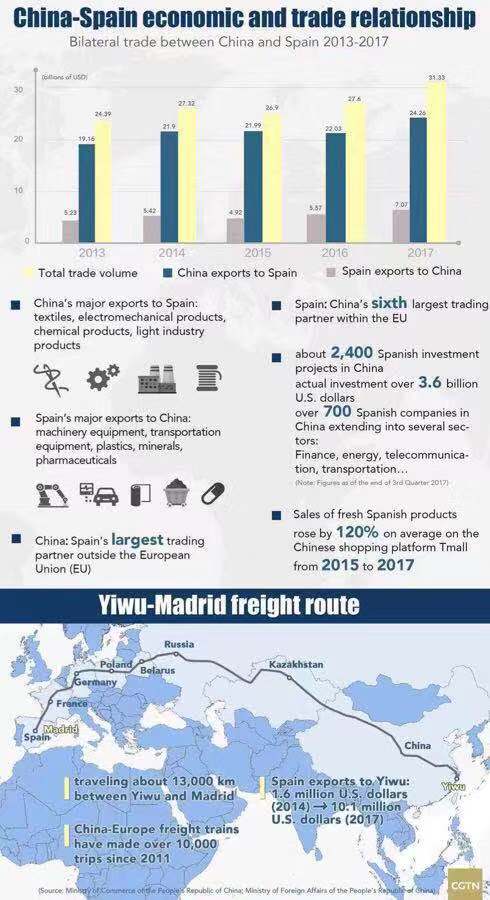 Meanwhile, Chinese investments in Spain have seen a rapid growth since the European debt crisis. By the end of 2017, the stock of Chinese investment in Spain had exceeded 2.3 billion U.S. dollars covering various areas including energy, finance, transport, telecommunications, infrastructure, agriculture, food industry and tourism.
