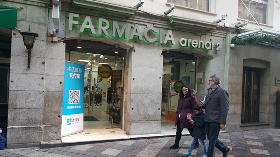 Photo taken in a busy street of Madrid shows an advertisement of Alipay, Alibaba’s third-party mobile and online payment platform. (People’s Daily/Ye Qi)