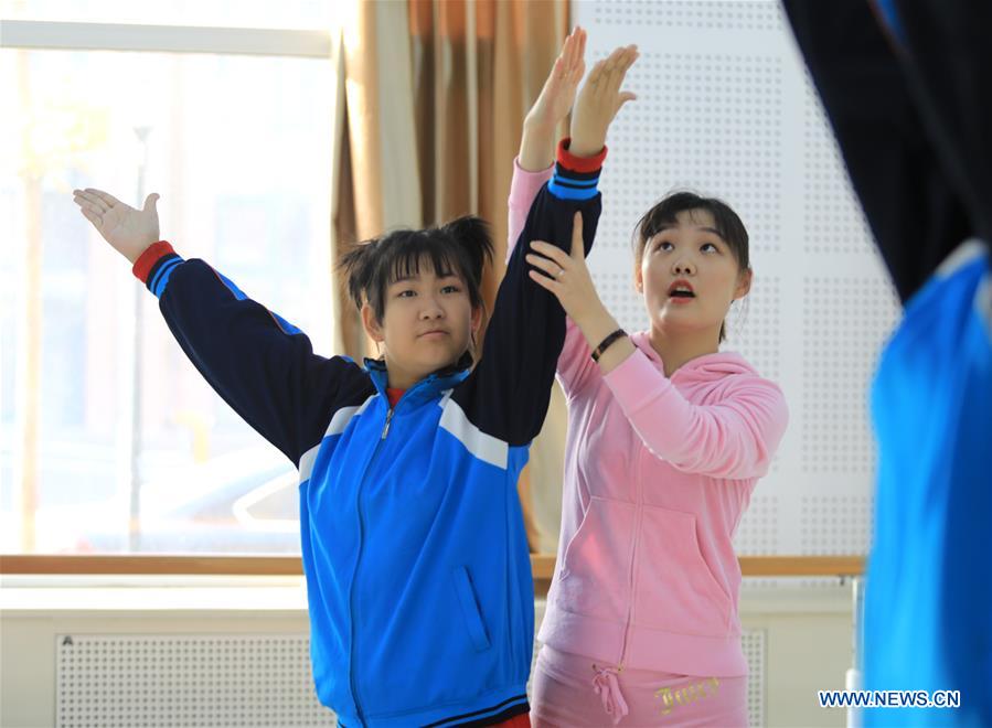 Special education teacher Zhao Yu instructs a student during a dance rehearsal in the municipal special education school in Shijiazhuang, capital of north China's Hebei Province, Nov. 29, 2018. As a dance teacher at the Shijiazhuang Municipal Special Education School, Zhao Yu has to break down communication barriers with the students, who suffer from either visual/hearing impairment or autism. Her dancing team has won multiple honours in art events nationwide, but it took time and effort to achieve successful cooperation. "A five-minute dance might cost us more than 700 days of rehearsal, during which tens of thousands of repetitive trainings are done," said Zhao. (Xinhua/Liang Zidong)