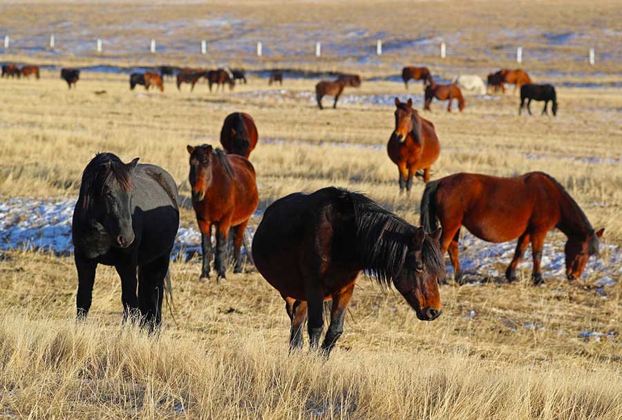 Horses graze on the prairie at the Shandan Military Horse Farm, NW China's Gansu province, during the winter.[Photo by Cheng Lin for chinadaily.com.cn]
