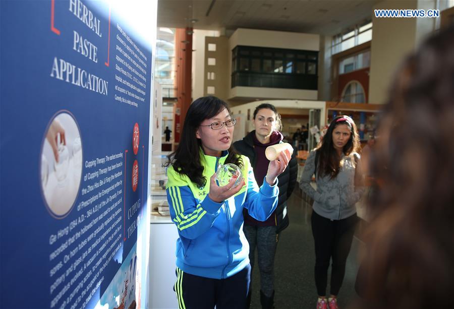 Interpreter Li Zhengya explains traditional cupping therapy to visitors at Mater Dei Hospital in Msida, Malta, Dec. 2, 2018. People showed interest in the traditional Chinese medicine (TCM) as they visited the "Benevolence and Healing Art" TCM exhibition at Malta's main hospital Mater Dei. The exhibition showed the TCM history, its specific characteristics, healing techniques, achievements and worldwide application with pictures and posters to publicize the traditional Chinese medicine in Malta. (Xinhua/Yuan Yun)