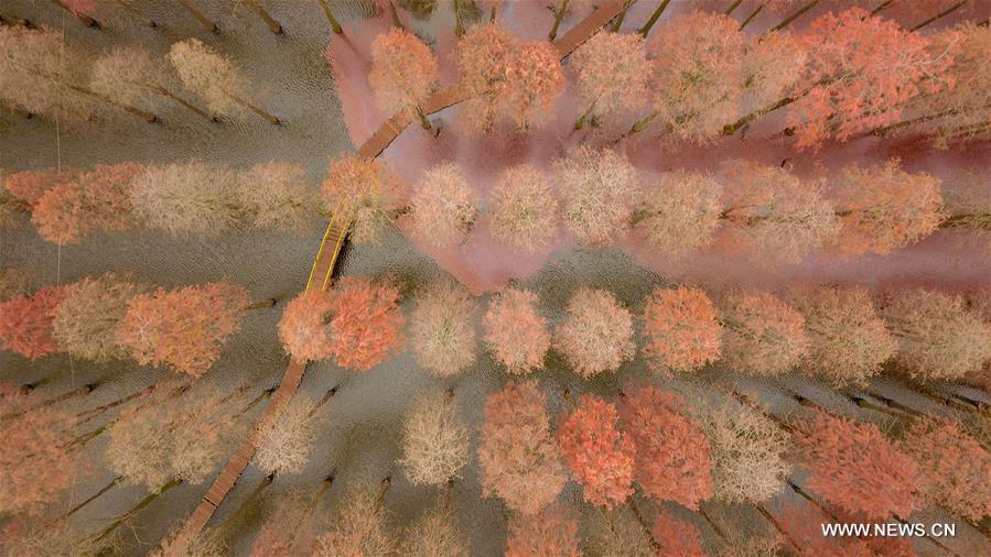Aerial photo taken on Dec. 7, 2018 shows the scenery of redwood forest at a wetland park of Luyang Lake in Yangzhou City, east China's Jiangsu Province. (Xinhua/Meng Delong)