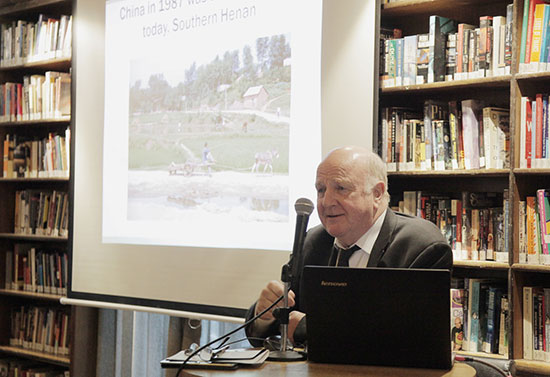 Bruce Connolly shares his stories at Bookworm in Sanlitun, Beijing, Dec 12, 2018. [Photo by Chen Xinyu/chinadaily.com.cn]