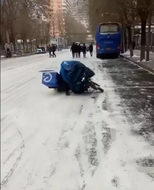 A food delivery man fell down on a slippery road in Lanzhou, Gansu province.